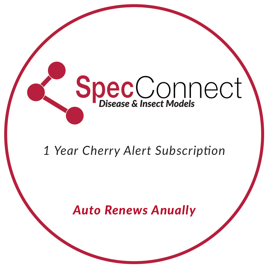 SpecConnect Cherry Alert Package (1 Year Subscription)(0)No Reviews yet Item #: 3095CHP $149.00 Quantity discounts available QuantityPrice Quantity -+ Add to Shopping Cart Product Description SpecConnect Cherry Alert Package Required Sensors: Leaf Wetness and Temperature Models Included: Leaf Spot, Insect Models Documents Product DescriptionDocuments Back Product DescriptionSpecConnect Cherry Alert Package Required Sensors: Leaf Wetness and Temperature Models Included: Leaf Spot, Insect Models 1 Year Subscription Required Back Documents Spectrum - All Products (Product Catalog).pdf Reviews 0 Back Ratings & ReviewsNo reviews availableBe the first to Write a Review