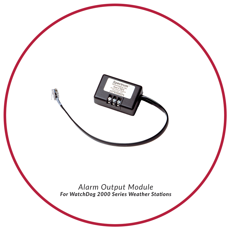 The Alarm Output Module can be installed on a WatchDog 2000 Series Weather Station ONLY (no longer available). Program to trigger external response devices under specified weather conditions. Activate an irrigation system, thermostat, fan, etc. 1 amp AC/DC maximum switching current. Motors and other high powered equipment will require electrical relays.